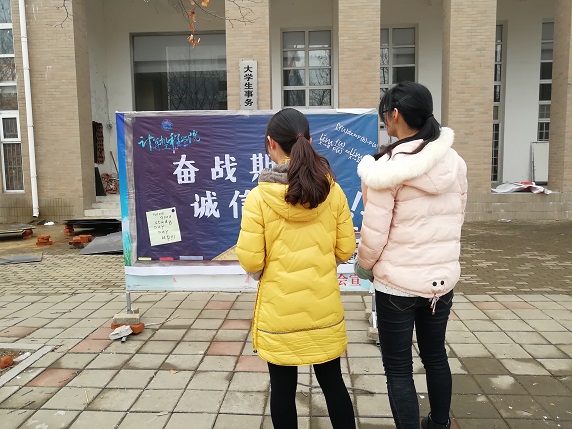 为迎接期末考试,鼓励同学们认真复习,积极备考,诚信考试,计算机工程学院在校园主干道及教学楼前开展了以“奋战期末,诚信应考”为主题的教育活动。 面对即将来临的考试,同学们首先应该端正考试态度,做一名诚信考生。计算机工程学院告诫学生“生命的本质从真实开始,人格的尊严从诚信起步”,呼吁大家“奋战期末,诚信应考”,并号召广大学生在横幅上签字,以此来提醒同学们充分把握复习时间,在积累、巩固的基础上,认真准备最后阶段的复习,以严谨的态度对待每一场考试,以实力争取优异的成绩,以诚信展现良好的学风。 此次教育活动旨在提醒同学们自觉遵守考纪,诚信应考,对自己负责。也预祝同学们都在公平公正的考试环境中,取得优异的成绩。(文/张泽群、朱程)