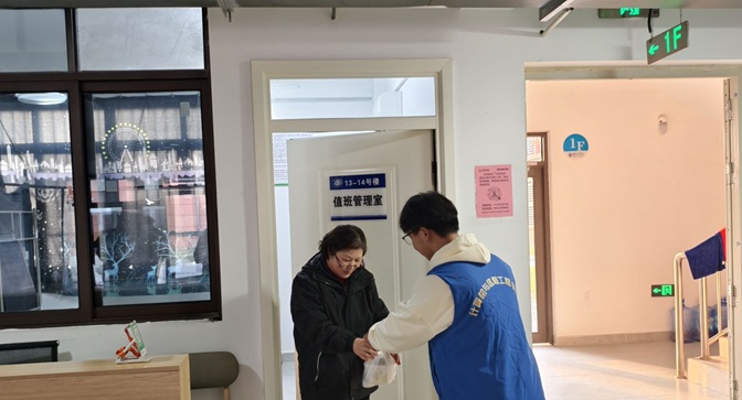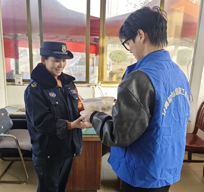经过大家的共同努力,一排排形态各异的饺子很快摆满了托盘。随后,食堂阿姨将包好的饺子逐一煮熟,热气腾腾的饺子出锅时,香气四溢,温暖了整个活动现场。为了让这份温暖传递给校园里默默付出的守护者们,同学们分成多个小组,小心翼翼地将煮好的饺子打包好,分别送往办公室、校园门卫室、学生宿舍值班室以及校园环卫工作点。
